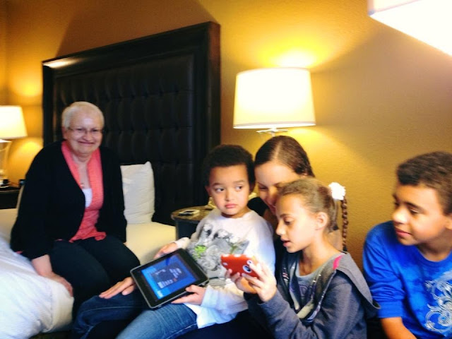 Owen kept sitting on me and telling me how good I smelled. He and Ari were rubbing all over my face and hair and squeezing their hind ends on any piece of my lap that was available. Ethan was helping my dad bring all the luggage into my parents hotel room but soon joined in on the hugs galore.